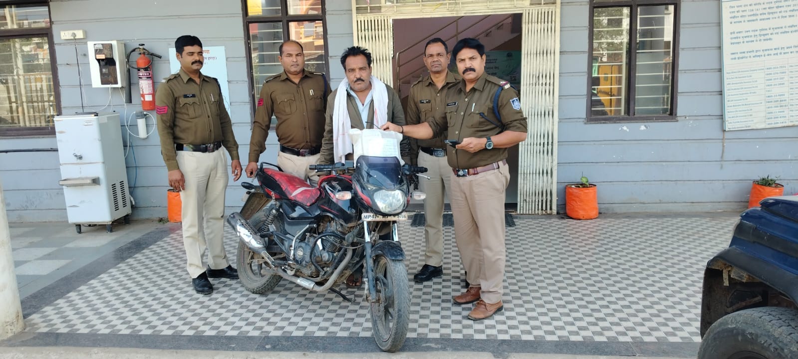 थाना सिविल लाईन हरदा में रात्रि में मुखबीर सूचना अवैध मादक पदार्थ गांजा विक्रय की प्राप्त होने पर थाना प्रभारी निरीक्षक आर.एस.तिवारी के नेतृत्व में टीम के सजंय ठाकुर , विजय प्रजापति, वीरेन्द्र राजपूत सूरज पासी , सैनिक संतोष ओझा व्दारा सूचना तस्दीक की गई जो पुरानी पुलिस चौकी खंडवा रोड हरदा पर मुखबीर व्दारा बताई गई एक पल्सर मोटर सायकल क्रमांक MP 47 MJ 5766 पर रोशन खलीफा एकान्त में मोटर सायकल पर बैंठा था उसके दाहिनें हाथ में एक थैला था पुलिस को देखकर रोशन खलीफा इधर उधर होने का प्रयास करता उसके पहले उसे घेरा बंदी कर पकड़ा साथ लाये, नाम पता पूछनें पर अपना नाम रोशन शाह पिता मेहबूब शाह उम्र 59 साल निवासी मानपुरा हरदा बताया जिसके हाथ में ली हुई थैली में अवैध मादक पदार्थ गांजा कुल 1.223 किलोग्राम कीमती 15000 रुपयें का मिलने पर NDPS के प्रावधानों का पालन करते हुए विधिवत जप्त किया गया । साथ ही घटना में प्रयुक्त मोटर सायकल क्रमांक MP 47 MJ 5766 कीमती 100000 रूपये की विधिवत जप्त की गयी । कुल जप्ती माल का मूल्य 1,15,000 रूपये आरोपी रोशन शाह उर्फ खलीफा से जप्त किया गया। आरोपी के विरूध्द थाना सिविल लाईन हरदा पर अपराध क्र 45/2026 धारा 08/20 एनडीपीएस एक्ट का पंजीबध्द कर विवेचना में लिया जाकर आरोपी को माननीय न्यायालय प्रस्तुत किया गया जहा से जिला जेल हरदा भेजा गया।