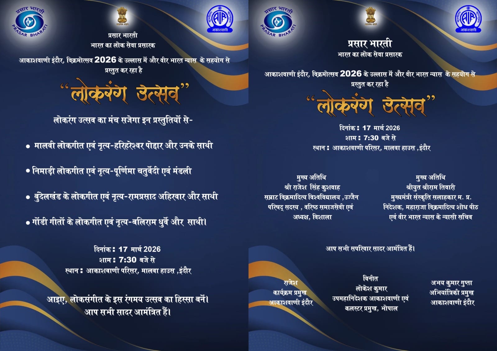 विक्रमोत्सव-2026 के उल्लास में “लोकरंग उत्सव” कार्यक्रम आयोजित किया गया है। यह कार्यक्रम 17 मार्च 2026 को शाम 7:30 बजे से आकाशवाणी परिसर, मालवा हाउस, इंदौर में आयोजित होगा।