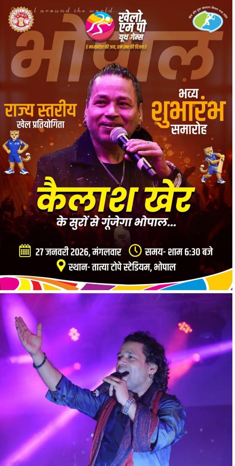 कार्यक्रम की जानकारी देते हुए सहकारिता, खेल एवं युवा कल्याण मंत्री विश्वास कैलाश सारंग ने बताया कि खेलो एमपी यूथ गेम्स के राज्य स्तरीय शुभारंभ समारोह को विशेष रूप से भव्य, आकर्षक और यादगार बनाया गया है। उन्होंने बताया कि समारोह का मुख्य आकर्षण सुप्रसिद्ध पार्श्व गायक कैलाश खेर की लाइव भव्य संगीतमय प्रस्तुति होगी। उनकी सशक्त आवाज़, लोक-संगीत की आत्मा और ऊर्जा से भरपूर गायन से पूरा तात्या टोपे स्टेडियम संगीतमय उल्लास और रोमांच से गूंज उठेगा।