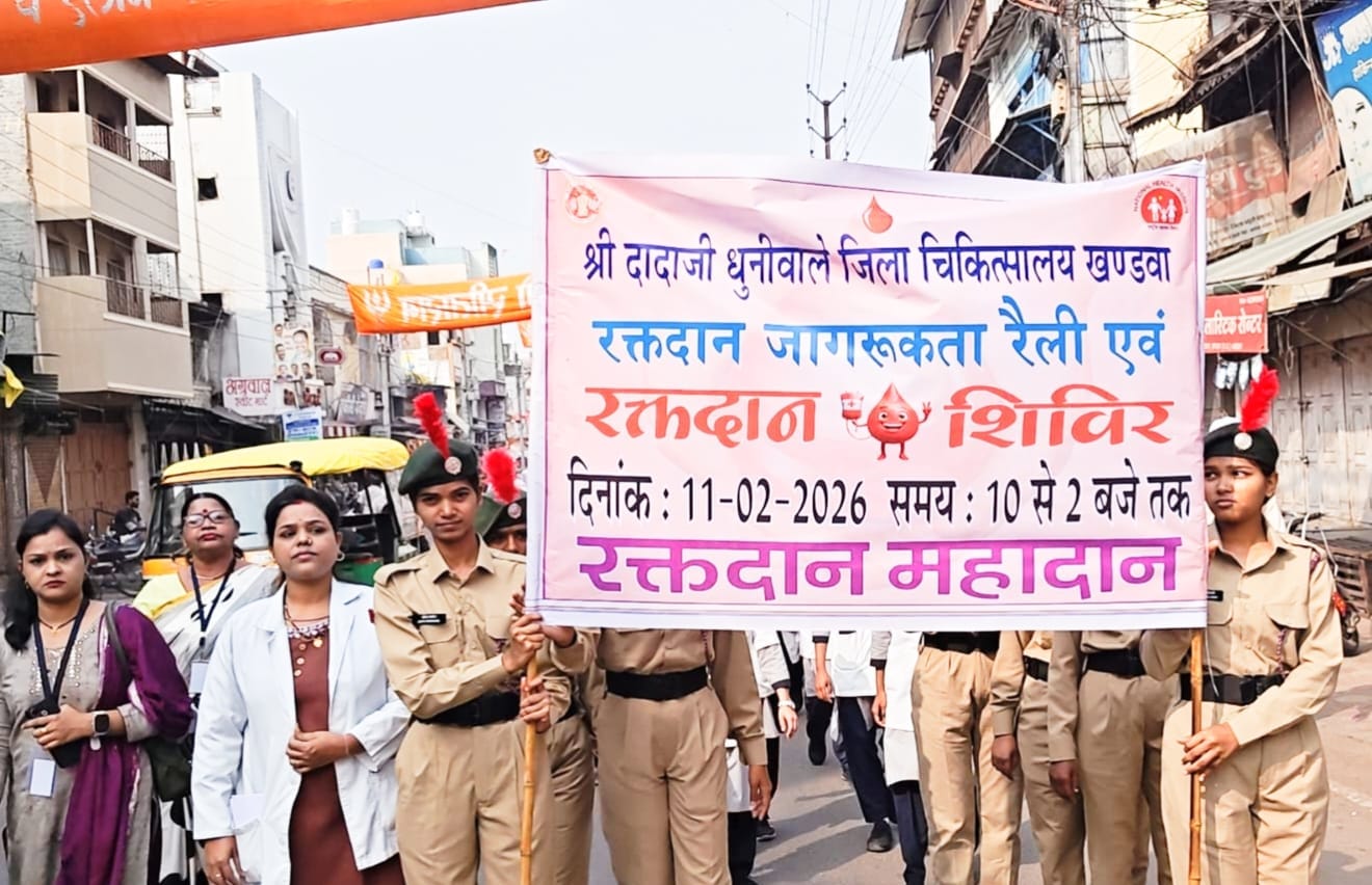 खण्डवा – रक्तदान के प्रति जनजागरूकता के लिए बुधवार को जिला चिकित्सालय परिसर खण्डवा से नर्सिंग छात्राओं, स्वास्थ्य कार्यकर्ताओं, आशा कार्यकर्ताओं, स्वयंसेवी संस्थाओं के प्रतिनिधि, एन.सी.सी. के केडेट्स तथा विभागीय अधिकारी कर्मचारीयों की जनजागृति रैली को विधायक प्रतिनिधि मुकेश तन्वे ने हरी झंडी दिखाकर रवाना किया। इस दौरान सिविल सर्जन डॉ. अनिरुद्ध कौशल, नोडल अधिकारी ब्लड बैंक डॉ. अतुल माने, मेडिकल कॉलेज के अधीक्षक डॉ. रंजीत बड़ोले, सहायक अधीक्षक डॉ. सुनील बाजोलिया, जिला कुष्ठ अधिकारी डॉ. पर्व तिवारी, चिकित्सक व अधिकारी कर्मचारी उपस्थित थे। रैली के माध्यम से रक्तदाताओं को जागरुकता का संदेश देते हुए रक्तदान करने की अपील की गई। यह रैली नगर निगम, बॉम्बे बाजार, बस स्टैण्ड, रेल्वे स्टेशन से मछली बाजार, जलेबी चौक से होती हुई जिला चिकित्सालय परिसर खण्डवा में सम्पन्न हुई।