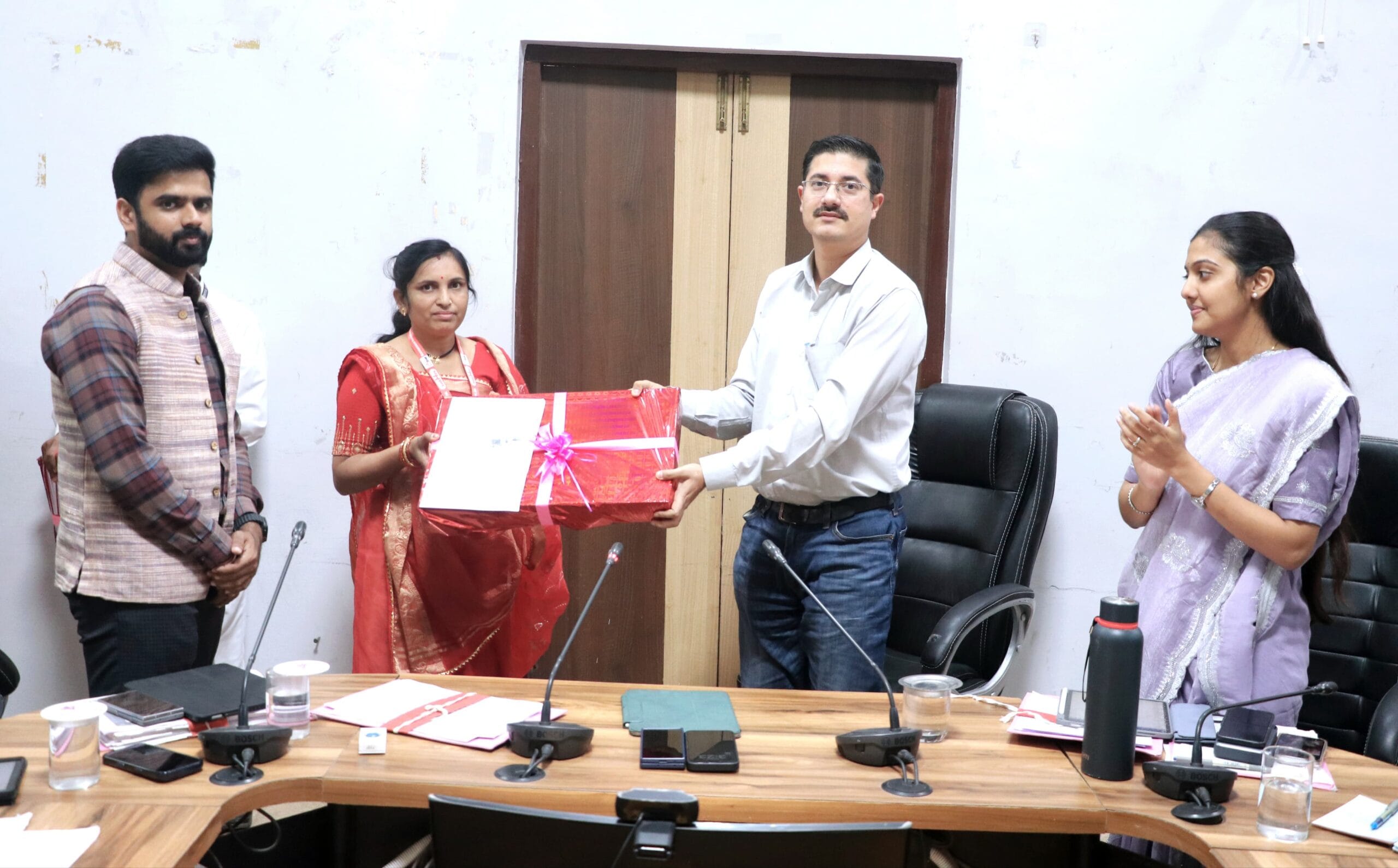 खण्डवा 23 फरवरी 2026, कलेक्टर गुप्ता ने कलेक्ट्रेट सभाकक्ष में आयोजित साप्ताहिक समीक्षा बैठक में ग्रामीण आजीविका मिशन के महिला स्व-सहायता समूहों की 2 महिला बैंक सखियों श्रीमती मनीषा पटेल और श्रीमती सुनीता ओसवाल को लैपटॉप प्रदान किए। इस अवसर पर जिला पंचायत के सीईओ डॉ. नागार्जुन बी. गौड़ा, अपर कलेक्टर श्रीमती सृष्टि देशमुख गौड़ा, अपर कलेक्टर के. आर. बड़ोले, एसडीएम पुनासा श्री पंकज वर्मा सहित अन्य अधिकारी भी मौजूद थे।