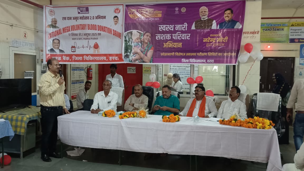 स्वस्थ नारी सशक्त परिवार अभियान के तहत बुधवार को माँ रेवा गार्डन हरदा में मेगा स्वास्थ्य शिविर व रक्तदान शिविर का आयोजन किया गया। शिविर में विशेषज्ञ चिकित्सकों द्वारा निःशुल्क स्वास्थ्य परामर्श दिया गया। शिविर में आयुष्मान कार्ड, आभा आईडी निर्माण, असंचारी रोगों की स्क्रीनिंग, एनीमिया एवं सिकल सेल रोगों तथा क्षय रोग सहित विभिन्न स्वास्थ्य सेवाएं दी गई।