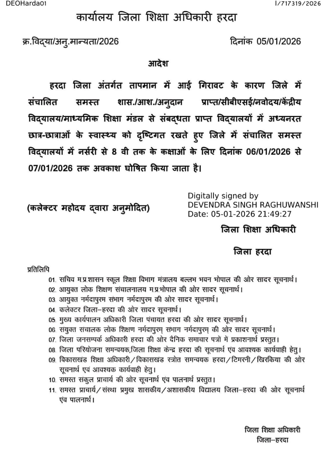 हरदा में तापमान में गिरावट आने के कारण कलेक्टर जैन ने सभी शासकीय स्कूलों एवं निजी स्कूल कल दिनांक 6/01/ 2026 से, 07/1/2026 तक दो दिन का अवकाश घोषित किया है जिला शिक्षा अधिकारियों को आदेश दिए हैं हरदा जिले में संचालित सभी शासकीय स्कूल, निजी स्कूलों के छात्र-छात्राओं को स्कूलों की छुट्टी घोषित की है वह सभी स्कूलों को आदेश की काफी शासकीय स्कूल एवं निजी स्कूलों को भेजते हैं और कल की लिए अवकाश घोषित कर दें