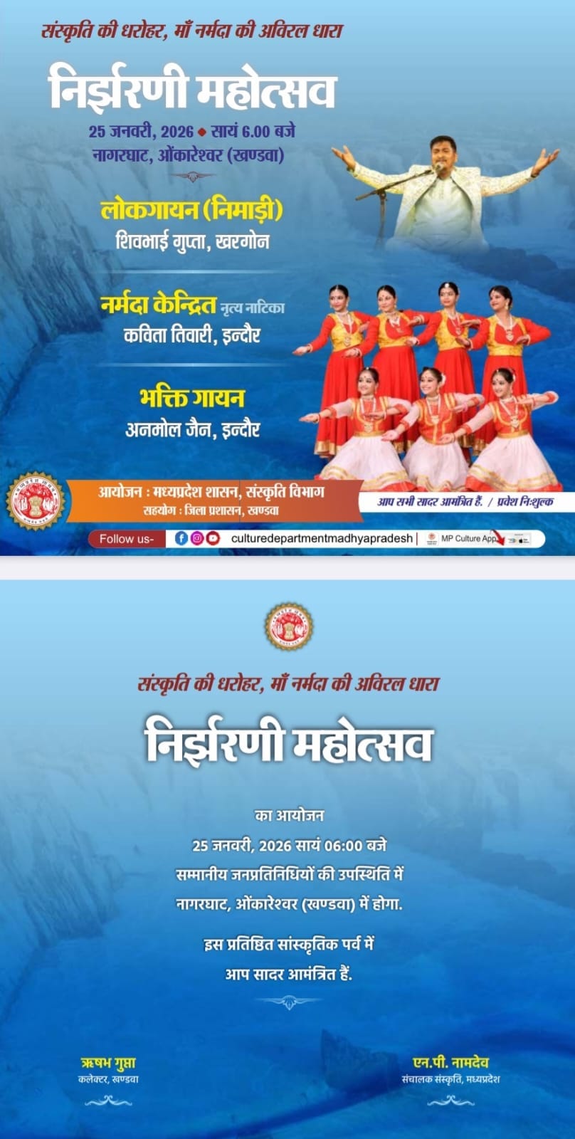खंडवा -नर्मदा जयंती के अवसर पर मध्य प्रदेश शासन के संस्कृति विभाग और जिला प्रशासन के सौजन्य से 25 जनवरी रविवार को सायं 6 बजे, ओंकारेश्वर के नागरघाट पर “निर्झरणी महोत्सव” का आयोजन होगा। इस कार्यक्रम में खरगोन के शिवभाई गुप्ता का “निमाड़ी लोकगायन” होगा। इसके साथ ही इन्दौर की सुश्री कविता तिवारी द्वारा नर्मदा केन्द्रित नृत्य नाटिका प्रस्तुत की जाएगी। इस अवसर पर इन्दौर के अनमोल जैन का भक्ति गायन भी होगा। कलेक्टर ऋषव गुप्ता ने बताया कि इस कार्यक्रम में प्रवेश निशुल्क है। उन्होंने नागरिकों से इस कार्यक्रम में शामिल होने का अनुरोध किया है।