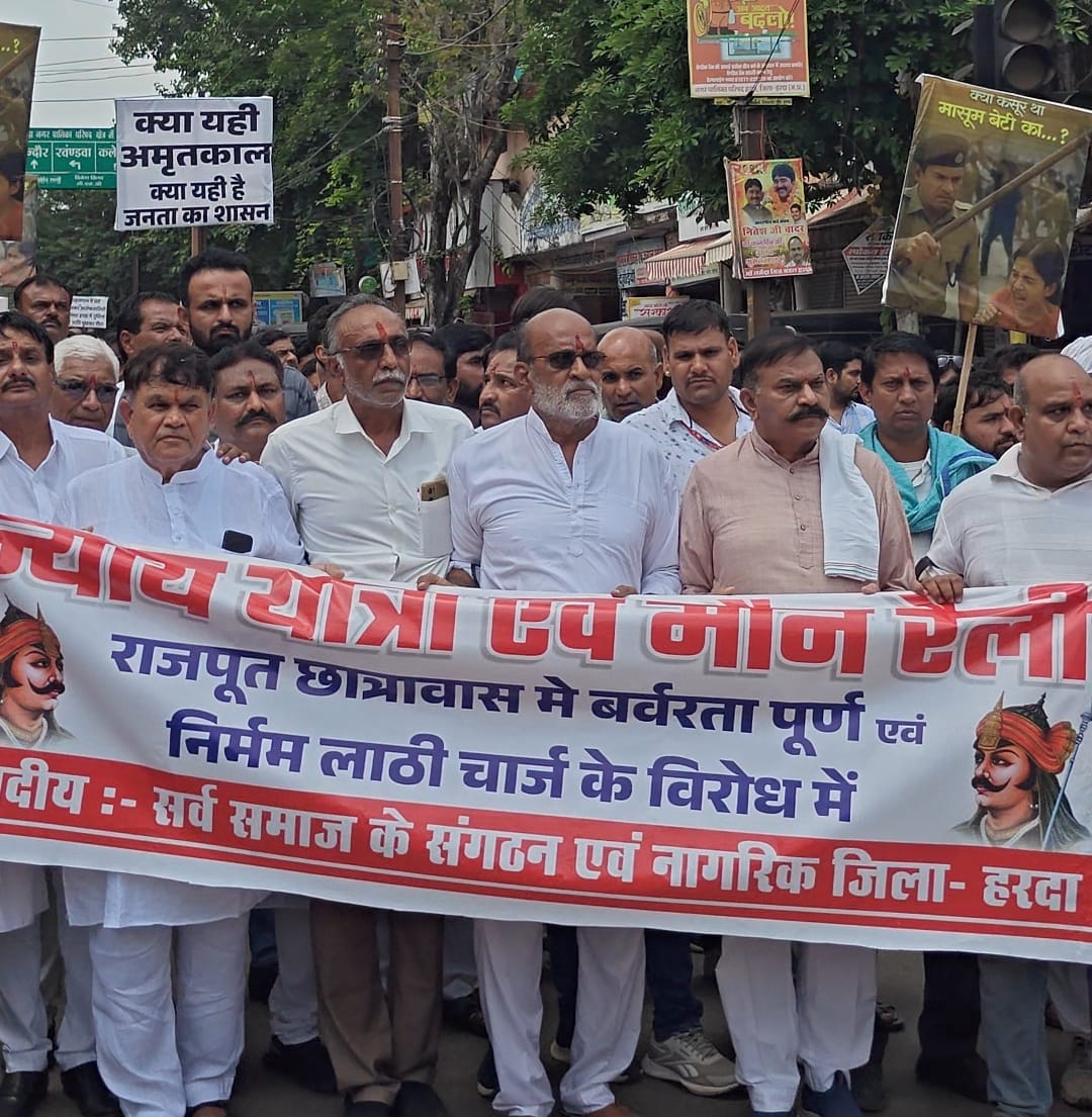 मुस्लिम समाज के मुफ्ती रिजवान अहमद ने भी का बंद समर्थन किया कल रात में ही उन्हें अपना समर्थन दे चुके थे पुलिस के द्वारा राजपूत छात्रावास में लाठी चार्ज किया था पुलिस प्रशासन को किसके आदेश पर यह कार्रवाई की गई इस चीज का खुलासा होना चाहिए जिसमें कई लोगों को घायल हो गए थे पुलिस प्रशासन को छात्रावास के अंदर घुसकर लाठी चार्ज नहीं करना था क्या छात्रावास में कोई अवैध गतिविधियां हो रही थी जिसके चलते पुलिस ने यह कदम उठाया हरदा एसडीएम कोर्ट से करणी सेना अध्यक्ष सुनील राजपूत एवं तीन साथियों को जमानत पर रिहा किया राजपूत ने बताया कि उन्हें एक लाख के मुकालचे पर छोड़ा गया जिसमें यह लिखा गया है कि वह किसी भी प्रकार की रैलियां में भाग नहीं ले सकेगा सुनील ने बताया कि हम शांतिपूर्ण रूप से प्रदर्शन कर रहे थे हमारे द्वारा पुलिस के ऊपर ना तो कोई कोई पत्थर पथराव किया गया हमारे पास कोई डंडे लाठी थे हम तो शांतिपूर्ण अपना प्रदर्शन कर रहे थे मगर पुलिस परेशान बड़ी बहरेमी से हमारे साथियों को हमको लाठियां से मारा जिसमें मेरे कई साथियों के पर हाथ टूट चुके हैं बहुत जल्द में इनका वीडियो बनाकर आप लोगों के सामने रखूंगा एक उन समाज के बालक को भी सर पर लगने से गुमराह हो चुका है वह बालक अभी दहशत में है पुलिस में राजपूत समाज के हटकर भी अन्य समाज के लोगों के साथ मारपीट की गई राजपूत समाज से पुलिस के रवैया से हमारे भी नहीं समझ में आया कि यह क्या हो रहा है उन्होंने समाज की दुकानों को भी जेसीबी से तोड़ा गया एक दुकानदार ने बताया कि उसके चैनल गेट टूट गई थी तो उसको पुलिस प्रशासन ने उसे सुधारने के लिए कहा रही है हम शांति से प्रदर्शन कर रहे साथियों की मोटरसाइकिल को भी जेसीबी से भरकर थाने में लाकर पटक दिया गया गाड़ियों का भी बहुत नुकसान हुआ पुलिस वालों ने फोर व्हीलर ओके भी कांच फोड़ दिए इन सबके चलते राजपूत परिषद द्वारा शांति मौन न्याय यात्रा निकल गई जिससे मैं शहर के सभी व्यापारियों ने समर्थन दिया इस रैली में सभी लोग बिल्कुल किसी से कुछ नहीं बोल रहे हाथ में तखती लिखी हुई थी शक्ति पर पुलवामा के भी जिक्र किया गया है बाद में तो पुलिस ने समाज पूछ कर लाठियां से मारा शांतिपूर्ण मौन रैली निकाली गई आज रैली राजपूत छात्रावास से घंटाघर होते हुए