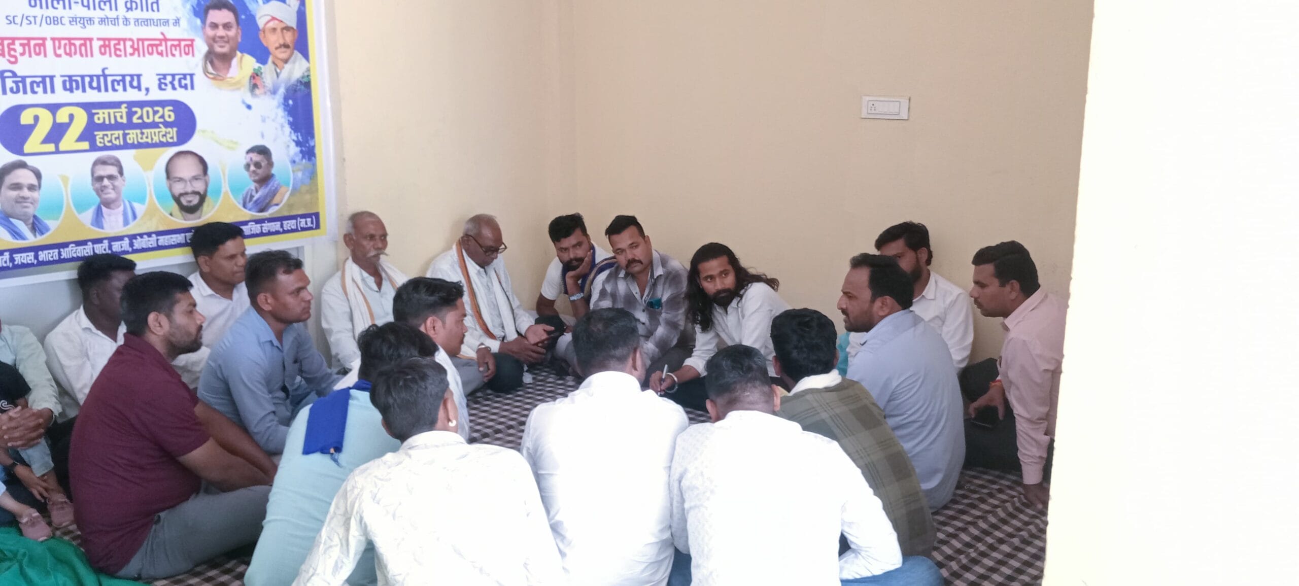 आज दिनांक 01/03/26 को समय दोपहर 12 बजे बैठक आयोजित की गई बैठक में सर्वसम्मति से निर्णय लिया गया कि की प्रदेश के प्रत्येक जिलों में टीम जाकर प्रचार प्रसार करेगी एवं हरदा जिले को 4 सेक्टर में बांटा गया है जिसमें अन्य दूसरे जिलों से आने वाले सामाजिक संगठनों के पदाधिकारी कार्यकर्ताओं के लिए भोजन की व्यवस्था की जाएगी जिसमें हंडिया टिमरनी एवं सिराली खिरकिया में भोजन की व्यवस्था रखी जाएगी कार्यक्रम की तैयारी को लेकर 10 सदस्यों की एक कमेटी गठित की गई है जो समय-समय पर कार्यक्रम को लेकर दिशा निर्देश जारी करेगी महाआंदोलन में लाखों की तादाद में एससी एसटी ओबीसी समाज एकजुट होगा