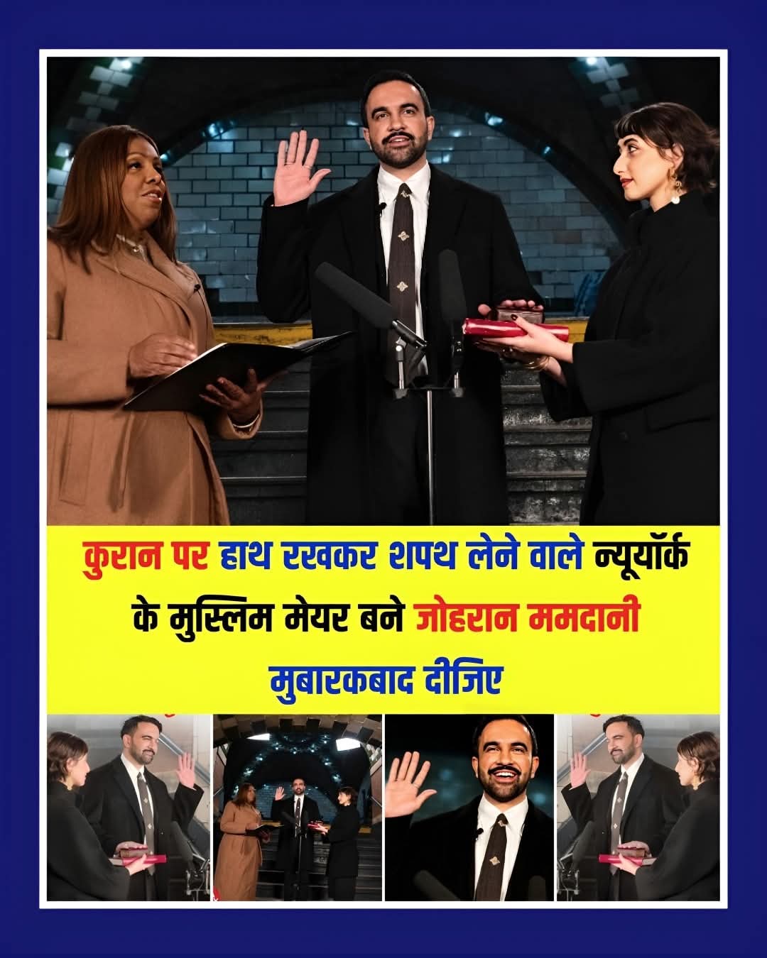 कुरान पर हाथ रखकर न्यूयॉर्क के मेयर पद की शपथ लेने वाले मुस्लिम मेयर बने ज़ोहरान ममदानी – यह सिर्फ एक शपथ नहीं, बल्कि इतिहास में दर्ज होने वाला लम्हा है। न्यूयॉर्क में कुरान पर ली गई ये कसम, दुनिया भर के कमज़ोर, अल्पसंख्यक और चुप कराए गए लोगों की हिम्मत बनकर गूँज रही है।यह पल साबित करता है कि मज़हबी आज़ादी, विविधता और बराबरी अब सत्ता के केंद्र तक पहुँच चुके हैं।